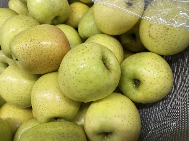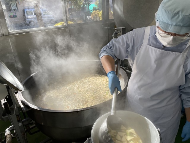 今日は冬に美味しい食材をたくさん使った献立でした。里芋ごはんは、里芋、にんじん、鶏肉、油揚げなどを煮て、ご飯と混ぜて作りました。人気のメニューで、1年生もよく食べていました。ぶりの竜田揚げは、どのクラスもほとんど空っぽの食缶が戻ってきました。みぞれ汁は、大根おろしをたっぷり34kg使って、体の中から温まる美味しいお汁ができました。りんごは、「サンふじ」を届けてもらうことが多かったですが、今日は青森県産の「王林」を届けてもらいました。「いつものりんごと味が違う」と味の違いに気づいた子もいました!