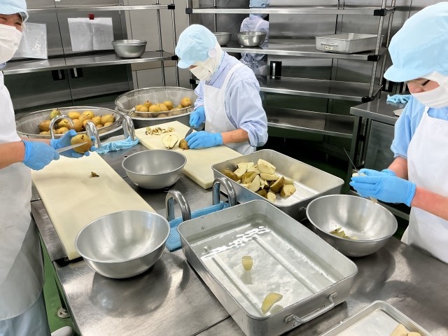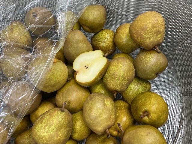 今日の果物は、洋梨でした。形がひょうたん型なので、皮剥き機を使えず、全て手作業で皮を剥きました。ラ・フランスという品種の洋梨で、柔らかくて甘くていい香りがして美味しい洋梨でした。食べたことがない人や苦手な人もいたようですが、おかわりの行列ができているクラスもありました。今の時期しか味わえない果物です。初めての味に出会って、美味しさを発見できた人が一人でもいたら嬉しいです。