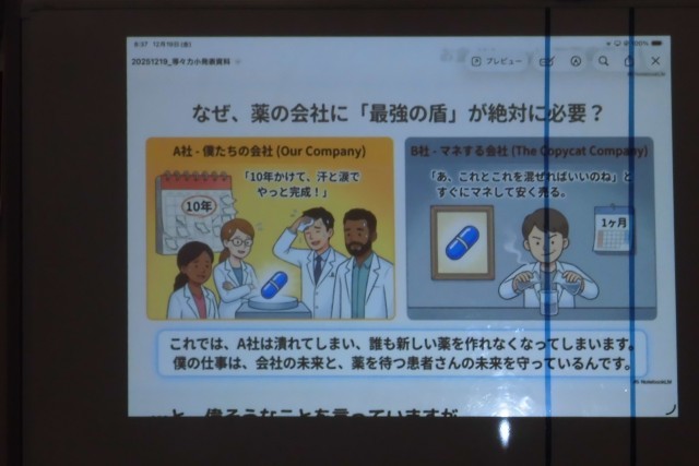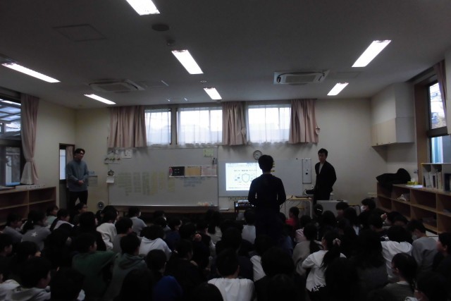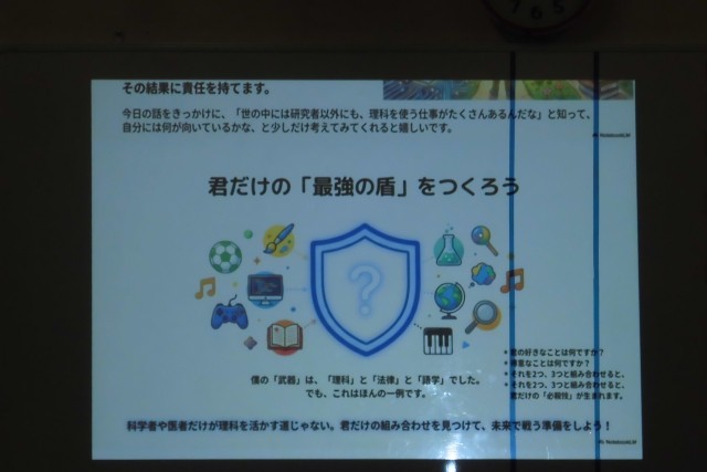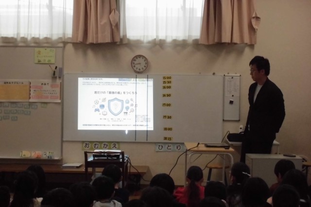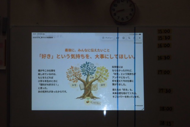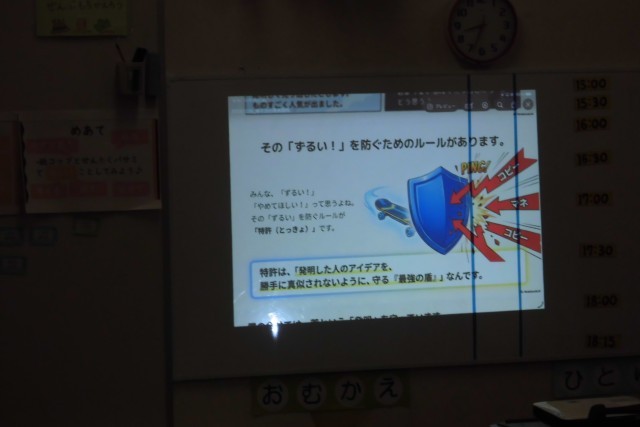 今日は、製薬会社の特許の部門でお仕事をされている、保護者の方をお迎えして、ゲストティーチャーとしてキャリア教育のミニ授業をしていただきました。小学校6年生の時に描いた夢の話から、特許は「発明した人のアイディアを、勝手に真似されないように守る『最強の盾』」であること、お仕事の具体的な内容、そのために今でもたくさん勉強されていることなど、プレゼンもご用意いただき、とても分かりやすくお話いただきました。「『好き』という気持ちを、大切にしてほしい。」「これからの道は、『自分で』で決めること。」「君だけの『最強の盾』をつくろう。」など、将来の「なりたい自分」を夢見る子どもたちに、素晴らしいメッセージを伝えていただきました。お忙しい中本当にありがとうございました。