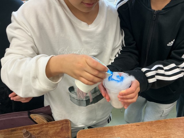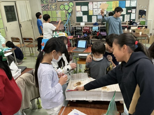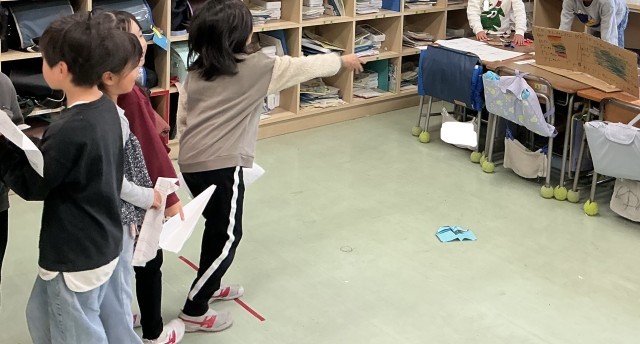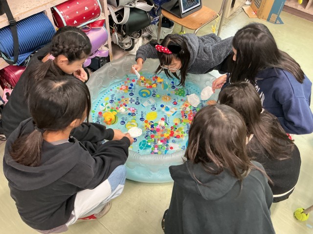 お店屋さんでは、紙のお金を用意して、使ったら穴あけパンチで穴を開け、レシートまで用意されているお店もあり、素敵なアイデアだなと思いました。かき氷屋さんでは、かき氷に見立てた綿に絵の具のシロップをかけて渡す工夫が見られ、アイデアに感心させられました。ティッシュで手作りのポイを用意し、スーパーボールすくいのお店を出しているグループもありました。子どもたちの生き生きとした表情がほほえましく、寒さも忘れてしまうほどでした。