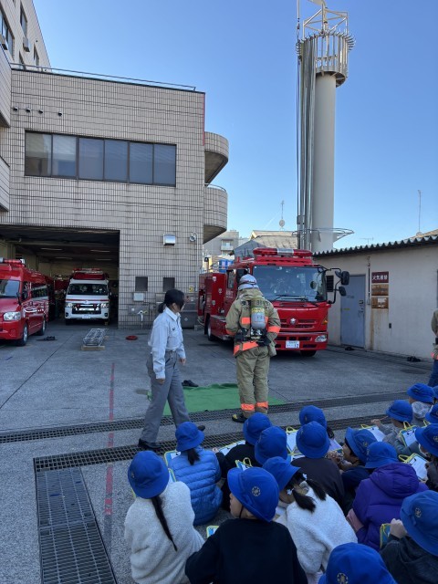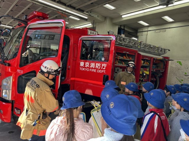 玉川消防署にて消防の仕組みなどについて見学させていただきました。前半は、消防士の着替えは1分内にできることについて、実際に見せてただきました。命を助ける大切な仕事のために、訓練を真剣に行なっていること、訓練に使う人形は大人の重さがあることなど、詳しく教えてくださいました。後半では、消防車の中には素早く乗るためにの工夫や、ホースの種類・使い方について丁寧に説明してただきました。学んだことをまとめの学習で生かしていきます。玉川消防署の皆様ありがとうございました。
