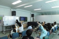 最後は実験です。科学に興味をもって欲しいという願いから、年に1回実験を全校朝会でやっています。今回は「空気砲」。ものが回転するとパワーが続いて、イルカのバブルリングの様な輪がけむりでも見えます。ご家庭でも身近なものでできる実験をやってみてください。