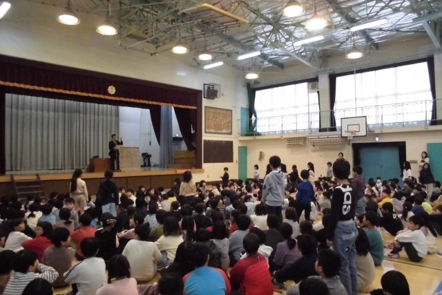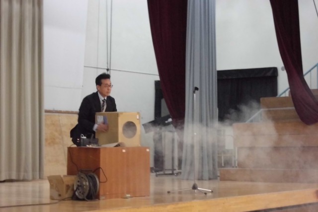 最後は実験です。科学に興味をもって欲しいという願いから、年に1回実験を全校朝会でやっています。今回は「空気砲」。ものが回転するとパワーが続いて、イルカのバブルリングの様な輪がけむりでも見えます。ご家庭でも身近なものでできる実験をやってみてください。