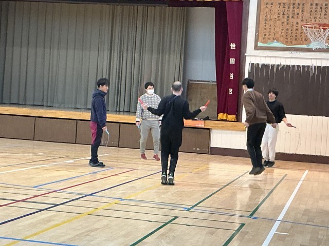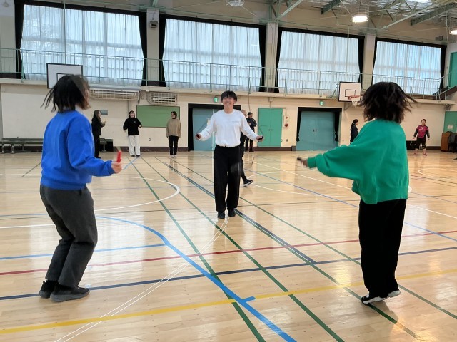 本校教員による、「縄跳び」と「表現運動」の実技研修を行いました。「縄跳び」をリズムよく跳ぶためには、音楽使うこと有効