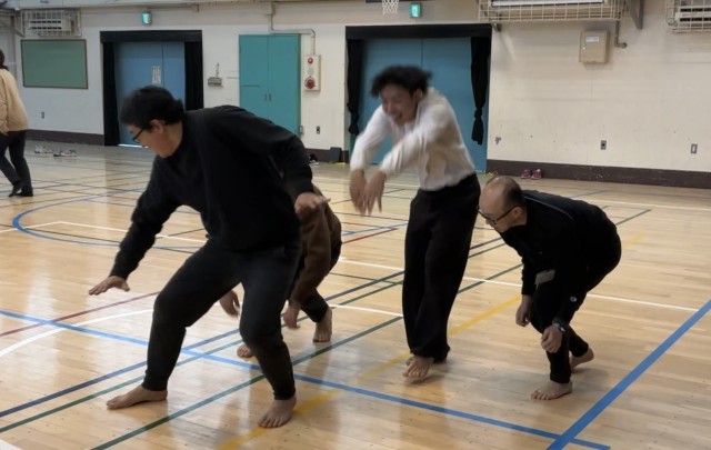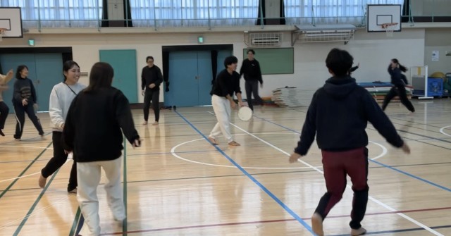 「表現運動」では、サークルの形に集まり、こちらも音楽に乗って教師の動きを真似したり、「⚪︎⚪︎になってみよう」とグループで考えて発表し合いました。グループ活動では、シンキングタイム・ダンシングタイム・シンキングタイム・ダンシングタイムを繰り返すと考えが深まること、「楽しい!!」と思えるように笑顔が大切など、基本を指導してくれました。