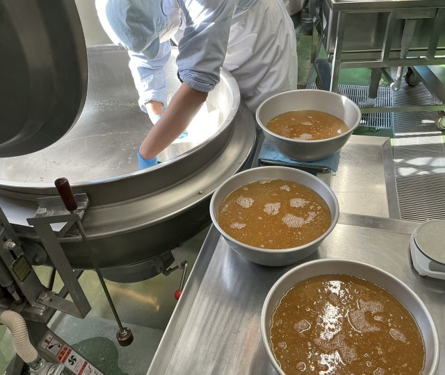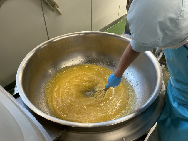 「ハチミツレモンジャム」は、八丈フルーツレモンを使って給食室で手作りしました。八丈フルーツレモンは、東京都八丈島の特産品です。普通のレモンの2倍の大きさで、苦味成分が少なく、甘みがあって、皮ごと丸ごと食べられるレモンです。12月から3月が収穫の時期です。今日の給食では、レモンを皮ごとみじん切りして、ハチミツと砂糖と水を混ぜてコトコト煮て作りました。とっても美味しいジャムができ上がりました。4年生の社会科で八丈島の勉強をしていると聞いて、給食の時間にレモンの実物を持って、4年生の教室に紹介しに行きました。大きさにびっくり、匂いを嗅いで「いい香り!」「ゆずの香りみたい」と感想を聞かせてくれました。