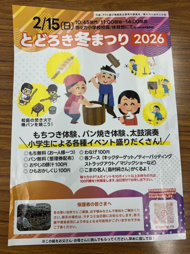 ・等々力小学校を卒業しても、この等々力の町に住み続ける人がいる。地域の方とのふれあいを大切にして一緒にこの町をもっと良い町にしていって欲しい。2月15日はとどろき冬祭り2026が開催されるのでたくさんの人に遊びに来て欲しい。合唱団やダンスチームなど出演する子どもたちの応援もしましょう。