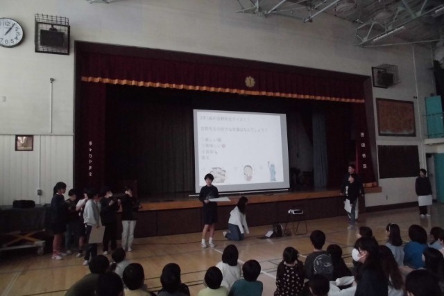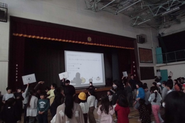 とど活ハッピープロジェクト、今回は「先生クイズ大会」です。放送委員の子どもたちが企画、運営をしてくれました。〇〇先生の好きなマンガは? 好きな言葉は? □□先生は年越しの時に何をしていた? ●●先生が毎日していることは? △△先生がやっていた習い事は?など、事前にしっかりと取材をして問題を作り、プレゼンにまとめて出題してくれました。たくさんの子どもたちが集まってくれて、とても楽しいクイズ大会となりました。放送委員会のみなさんありがとうございました。次回は2月6日に「だるまさんがころんだ大会」が開催される予定です。みなさん楽しみにしていてくださいね。