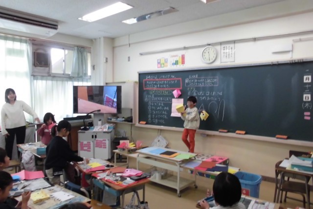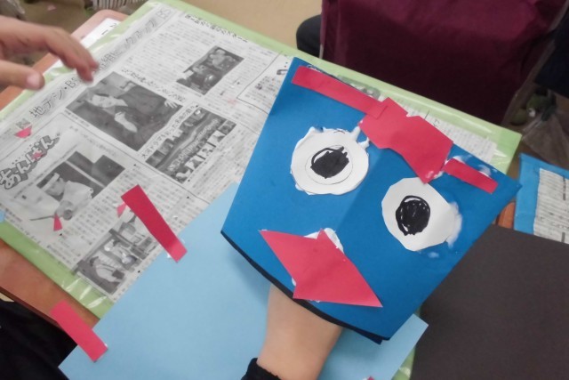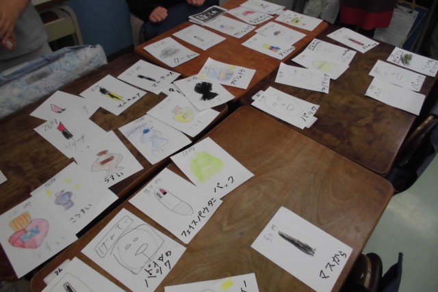 国語の時間には、「物の名前」について学習しています。パンの仲間、文房具の仲間、家具、化粧品など、子どもたちが決めたまとまりの言葉ごとに、商品を作りお店屋さんごっこをして楽しみながら言葉の学習をしました。図工の時間には、あそぼうよ「パクパクさん」というテーマで楽しく遊べるおもちゃを作っています。みんなニコニコで作っていました。