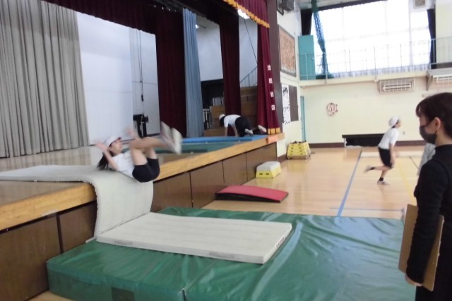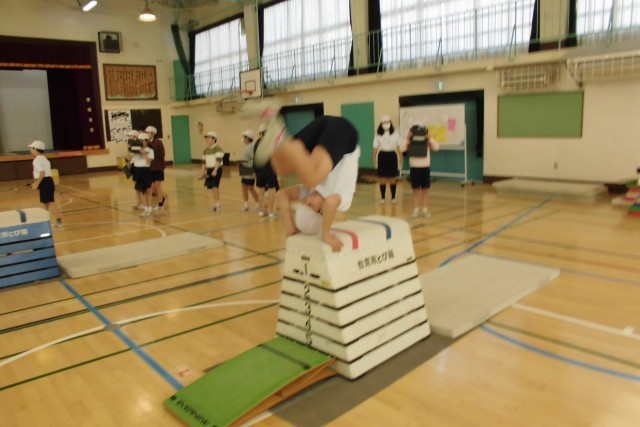 5年生の跳び箱の学習です。開脚跳び、抱え込み跳び、台上前転など、それぞれの課題をもってたくさん練習しました。段の高さも高く挑戦したり、きれいに着地できたりすると友達からも「いいね!」の声がかかり、達成感をもつことができました。