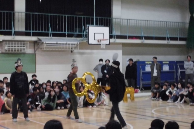 6年生からは、「ルパン三世」をモチーフにした劇をプレゼントしてくれました。大切な鍵をルパンに盗まれるという展開です。その大切な鍵は、しっかりと5年生に引き継がれました。「君に捧げる応援歌」の合唱や「ルパン三世のテーマ」の合奏もしてくれました。この曲はリズムがとても難しいですが、さすが6年生という素晴らしい演奏でした。