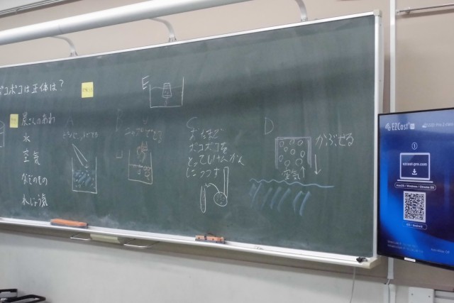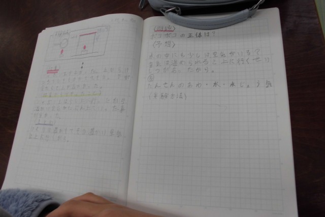 4年生の理科は「すがたを変える水」について考えています。これまで、水の「蒸発」について考えてきた4年生。今日は沸騰している水で現れる「あわ」のようなもの(今日はポコポコと表現していました。)は何だろう?が問題です。このあわのようなものは何かを予想し、その予想を解決するための実験方法をみんなで考えました。これまで分かっていることや生活経験をもとに、しっかりと科学的な思考をすることができました。
