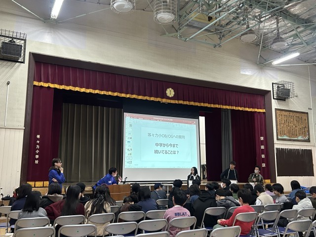 今日は卒後イベントが等々力小学校で行われています。第一部はよく学ぶ。等々力小学校の卒業生で今大学生の方たちがきてくれて、今頑張っていること、小学校時代の夢、中学校の部活などの経験談を話していただきました。4月から中学生になる6年生へ向けてすてきなお話でした。ありがとうございました。