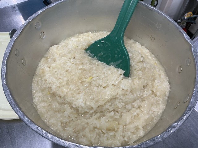 焼きカレードッグは、豚ひき肉と豚レバーミンチを玉ねぎと一緒に炒めて、ドライカレーを作り、胚芽パンに挟んで、チーズをのせて、オーブンで焼きました。コーンポタージュは、お米と玉ねぎを炒めて(写真2枚目)茹でた白いんげん豆と鶏がらスープと一緒にミキサーにかけて、滑らかにしてから、豆乳、牛乳、生クリーム、バターを加えてコトコト煮て、パセリを散らして仕上げました。果物は、三重県産の樹上完熟のエコ八朔を届けてもらいました。外の皮が薄くて、甘くてジューシーな美味しい八朔でした。スマイルカットに切りました(横に半分に切ってから、くし形に4等分に切っています)。色々な柑橘類を味わえる季節です。お家でもスマイルカットで色々なみかんを食べてみてください。