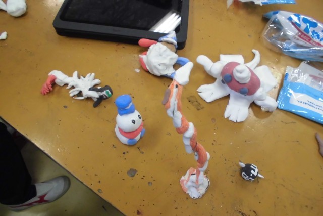 5年生は今「動いてクレイアニメーション」に挑戦しています。まず粘土で登場するものを作成し、そのキャラクターなどを動かし撮影し、アニメーションを作っていきます。出来上がったアニメ作品は、ぜひご家庭でもご覧ください。完成が楽しみです。