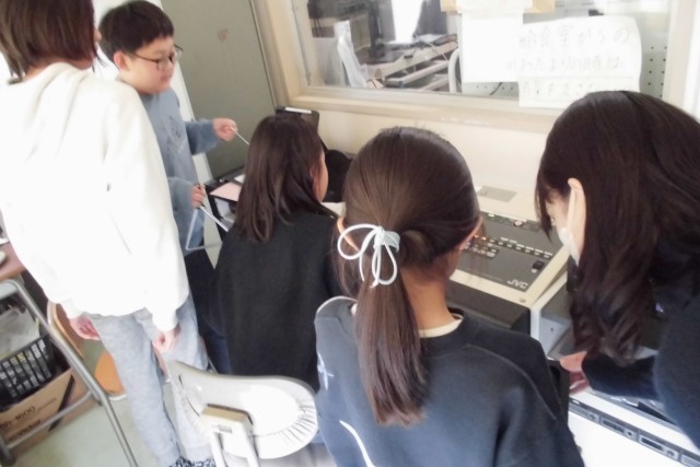 以前にご紹介した、放送委員会企画の「お昼の放送体験」が行われました。今日体験したのは3年生です。委員会のみなさんが丁寧に教えてくれて、いざ生放送がスタート。担任の先生クイズや生き物クイズを用意して放送してくれました。終わったあとインタビューすると「放送室は機械がたくさんあって自分なら操作できなそう。」「放送の本番は緊張したけど経験できてよかった。」「5年生になったら放送委員会に入りたい。」などの感想を話してくれました。素晴らしい経験ができましたね。放送委員会のみなさんありがとうございました。