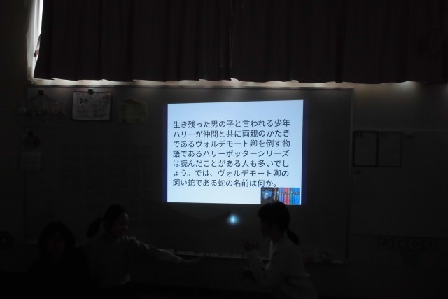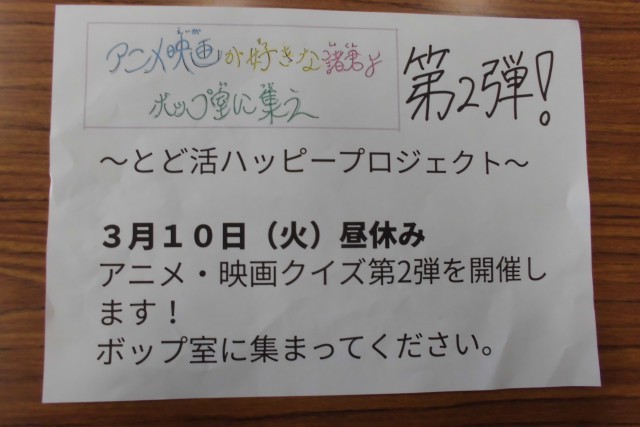 今回のとど活ハッピープロジェクトは「アニメ映画が好きな諸君よ。ボップ室集え~第2弾!~」です。6年生のみなさんが企画してくれたもので、その第2回目が行われました。スタジオジブリの映画やワンピースなどの大人気のアニメからクイズを作ってくれました。マニアックな難問もありましたが、1年生から6年生、先生方も答えていました。自分が大好きな映画やアニメのクイズになると、みんな興奮!6年生のみなさん楽しい企画をありがとうございました。好評につき、第3弾も開催してくれるそうですね。
