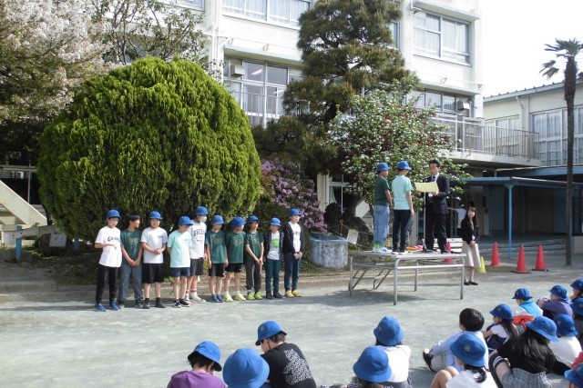 朝会の最後には、等々力グリーンズさんの表彰をしました。高学年チームが活躍しました。