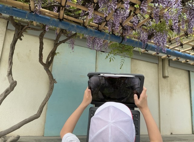 理科では、校庭にいる生き物を探しに行きました。春に関係がある生き物や、一年中いる生き物がいるかなどを見つけて、タブレットで撮影しました。「大きさを比べるには、定規で測るといいね。」「観察カードに書いた方が伝えやすいね。」と気付いたことを伝え合いました。