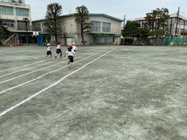 学年体育は50メートル走です。正面をみて走り抜けることを意識しながら全力で走り抜けました。