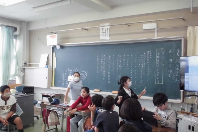 学級会を開いている学級の今日の議題は「学級目標を決めよう」です。議長団の子どもたちが上手にリードして、子どもたちだけでしっかりとそして楽しく話し合いを進めています。どんな学級目標に決まるのか楽しみです。