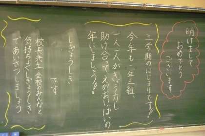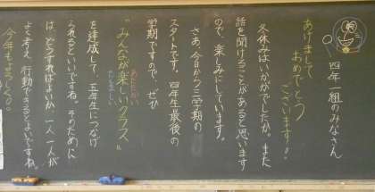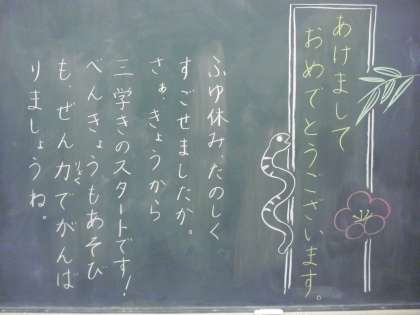 始業式を迎える朝、担任からの子どもたちに向けたあたたかなメッセージを多くの教室で見かけました。次の学年に向けての準備期間にもなる3学期、子どもたちにとってすてきな3学期になることを願っています。