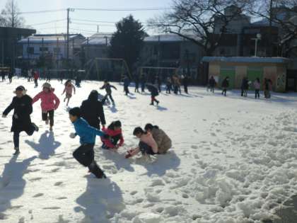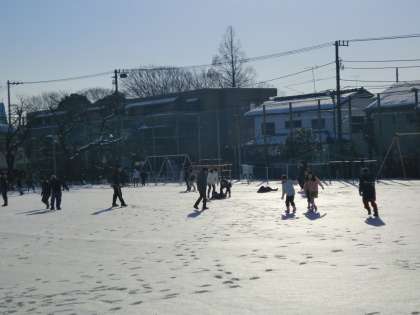 14日に降った雪が校庭一面に広がっています。朝一番に教職員が校門の前と学校周りの雪かきを行いました。1時間目は雪遊びの時間です。たくさんの子どもたちが東京の雪を楽しみました。雪合戦、雪だるま作りなどなど。楽しいひとときになりました。