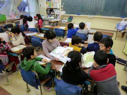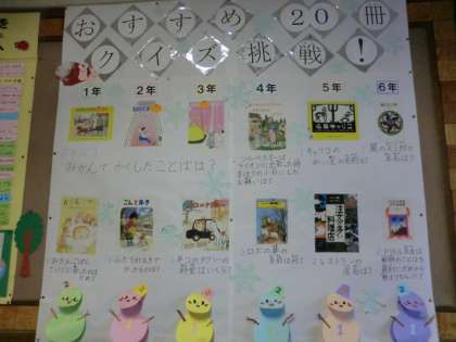 1月15日から1月25日まで3学期の読書週間が行われています。今日は、その取り組みの一つで「読み聞かせ交流」を行いました。1年生と4年生、2年生と5年生、3年生と6年生がペアになり、上学年が下学年へ読み聞かせを行います。一生懸命に本を選び、読み聞かせを行っていた上学年の子どもたち、真剣に聞いていた下学年の子どもたち・・・読書に親しむとても素敵な時間になりました。正面玄関には、図書ボランティアの皆様に作っていただくポスターが貼られています。いつもありがとうございます。