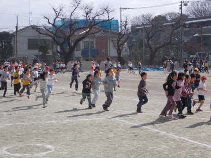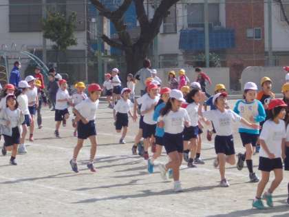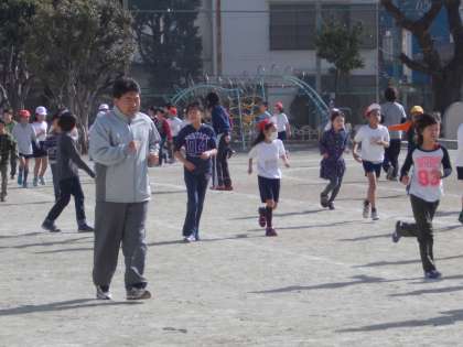 今日は、中休みに低学年の児童が元気に校庭を走りました。体を動かすのが大好きな低学年の子たちが先生たちと陽ざしを浴びながら音楽にのって走りました。