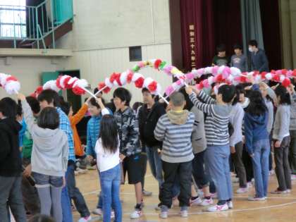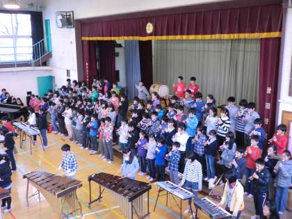 いよいよ6年生の出し物「合奏」です。迫力のある演奏に全校児童が引き込まれます。すばらしい演奏を披露してくれた6年生の瞳が輝いています。2回ものアンコールが起こりました。素敵な歌声も聴かせてくれました。最後に、全校児童が心を一つにして「気球にのってどこまでも」を合唱しました。心あたたまる「6年生を送る会」になりました。