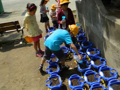 あさがおのたねうえをしました。朝、学校に来るとすぐにあさがおの様子を見て、水をあげています。ふたばがいつ出てくるのか、楽しみです。