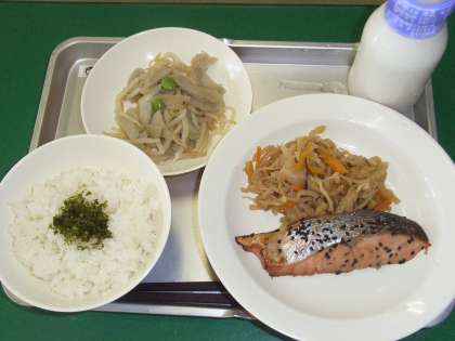 献立・・ごはん、牛乳、鮭の南部焼、切り干し大根の煮つけ、ごぼうサラダ