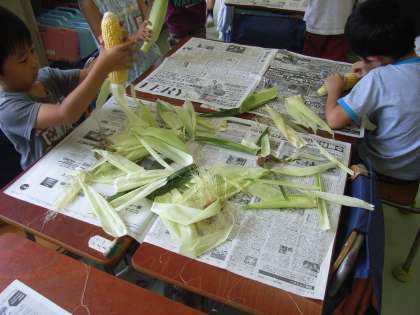 昨日、14日の給食には旬のとうもろこしがつきました。とうもろこしの皮むきを、1年生のみんなに手伝ってもらいました。前回のグリンピースの時よりは、力が必要だったようですが、みんな上手にむくことが出来ました。甘くておいしいとうもろこしでした。ごちそうさまでした。