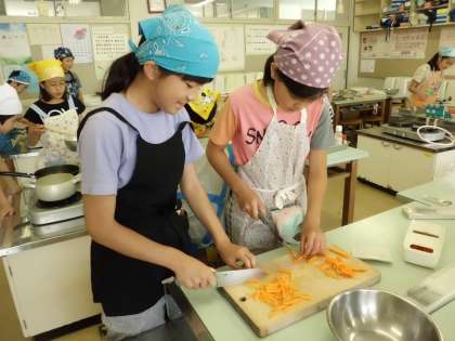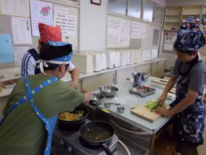 家庭科の調理実習での一コマです。グループごとに簡単おかずのレシピについて話し合い、材料を持ち寄って調理をしました。男子も女子も協力し、役割分担をして進めることができました。出来上がりが楽しみです。