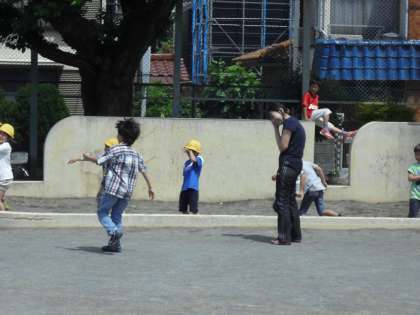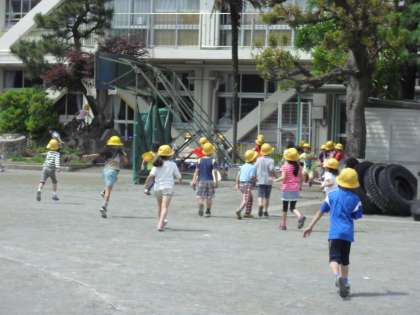 教育実習の先生と4年生が遊んでいます。1年生も黄色い帽子をかぶって元気に遊んでいます。チャイムがなると走って教室にもどってお掃除時間です。