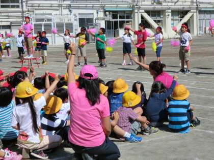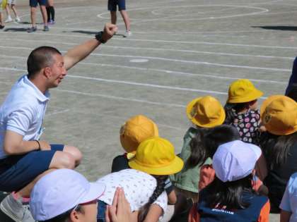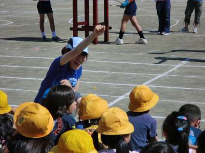 今日は、6月2日に行われる運動会の1日前練習です。朝は応援の練習をしました。元気に自分のチームを応援する子どもたち。先生も一生懸命応援しています。