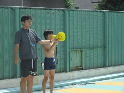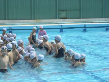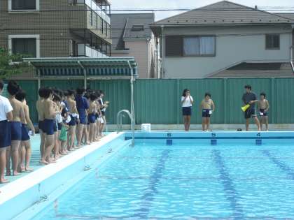 午後になり、グンと気温が上がり、プールに最高のコンディションになりました。いよいよ6年生にとって小学校生活の締めくくりの水泳指導が始まりました。写真はプール開きの様子です。「きまりを守って安全な楽しいプールにしましょう」「目標をしっかりもって頑張りましょう」という話の後、児童代表がそれぞれの目標を述べて、水泳の学習が始まりました。