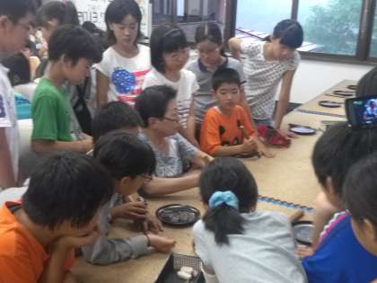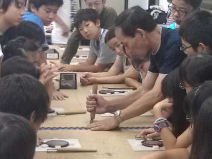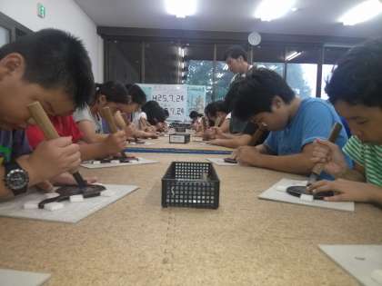 林間学園三日目。9時25分頃。木彫りの里で日光彫りに取り組んでいます。