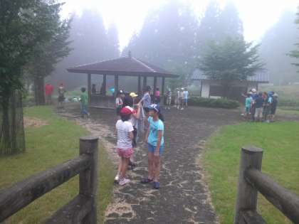 林間学園三日目。8時50分頃。木彫りの里で日光彫りに取り組む前に施設外の広場を散策。辺りは霧。