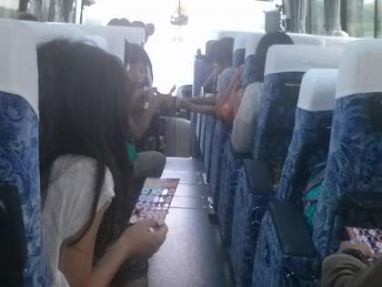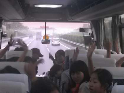 林間学園三日目。14時40分頃。天候は雨。羽生パーキング出発し、高速道路上です。車の流れは順調です。