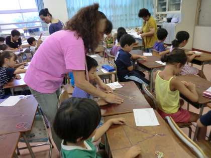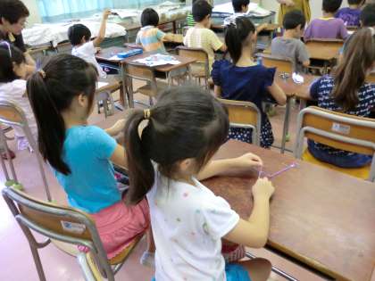 3日目の講座「ミサンガ」の紹介です。刺しゅう糸を丁寧に編み込み、腕に巻くミサンガを作りました。細かい作業で悪戦苦闘している子もいましたが、自分の腕にあった色とりどりのミサンが完成しました。