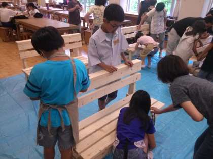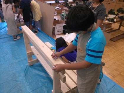ベンチづくり。組み立てと下塗りは昨日終わっています。今日は、デザインの下書きと塗装です。
