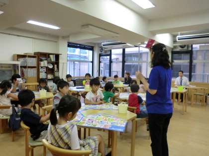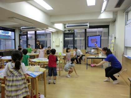 英語の講座の様子です。今日は、低学年対象でした。先生の発音をしっかり聞き、元気に表現する子供たち。英語の活動を体いっぱい使って楽しんでいました。