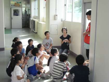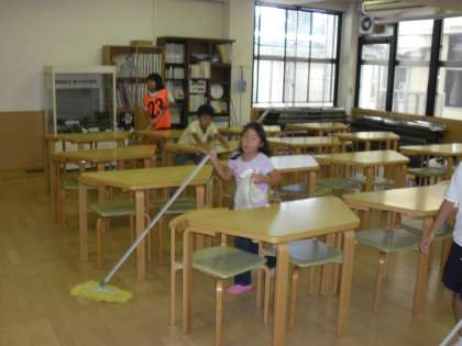 清掃時間の一コマです。いろいろな学年の子供が協力しあって清掃に取り組んでいます。
