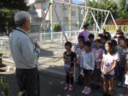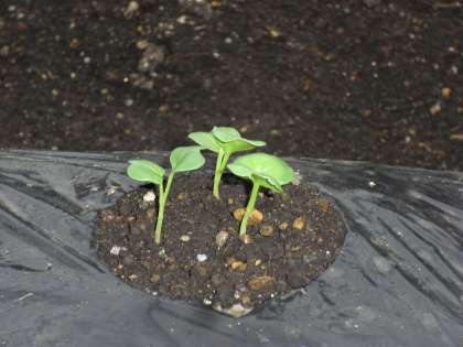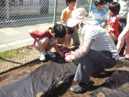 農協の方に指導していただき、食育の一環で大根やアブラナの種を植えました。(この写真は9月30日種植えと今日10月4日の様子)