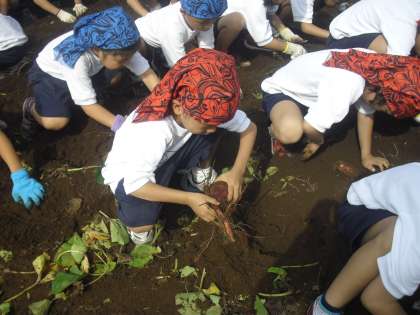 3日、1年生のみんなでさつまいもほりに行きました。子どもたちは、いものつるの長さにびっくりしたり、おいもが土の中から出てくると大喜びしたりしていました。地域の自然に触れながら、楽しくいもほり体験をすることができました。