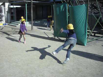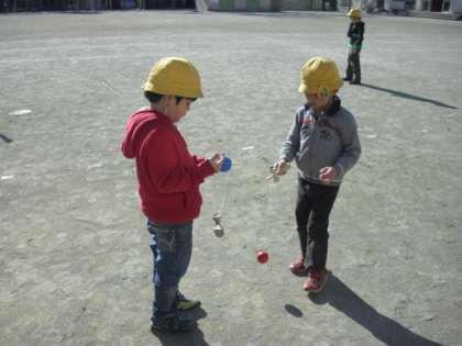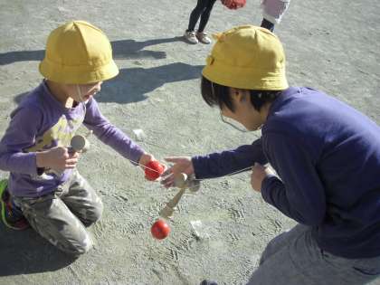 土曜授業で1年生が校庭の陽ざしの中で「けん玉」「はごいた」などに挑戦していました。けん玉を近くでやると、からまることも学びました…。