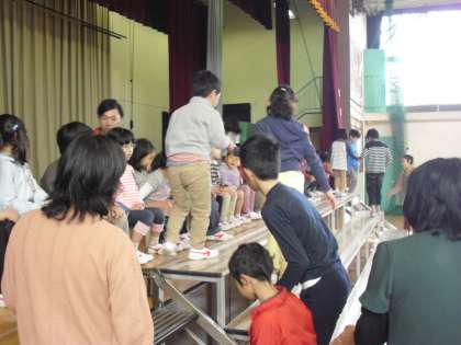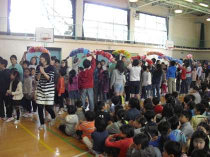 111名の1年生が体育館で2〜6年生の歓迎を受けました。写真は入場の様子です。