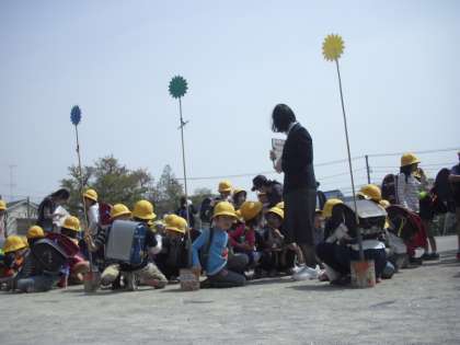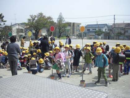 1年生が給食を食べている様子とコース別に下校するために校庭に集合しているところです。少しずつ小学校の生活に慣れてきました。