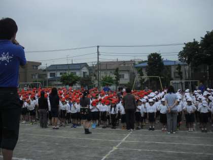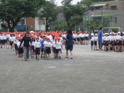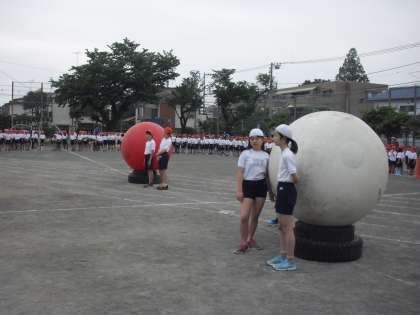 大玉送りの練習をしました。上手に並べたのですが、一年ぶりの玉送りということで、大玉が少し逆に動いて思うようにいかない場面もありました。でも、一生懸命に取り組むことができてよかったと思います。写真は大玉送りがいよいよ始まる場面。全校で背集まった時の様子。そして、行進して教室に戻る様子です。